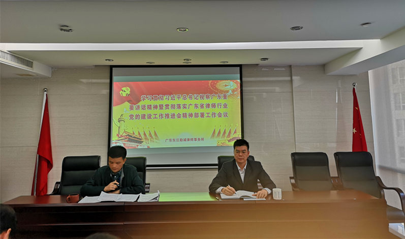 会议由广东东江勤诚律师事务所常务副主任叶勇主持。党支部书记、所主任谢文杰带领大家学习了习近平总书记视察广东重要讲话精神的重要内容,传达了广东省律师行业党的建设工作推进会的会议精神,强调要把学习贯彻习近平总书记视察广东重要讲话精神作为当前和今后一个时期的头等大事和首要政治任务,深刻认识习近平总书记重要讲话的重大政治意义、现实意义和深远历史意义,进一步增强学习贯彻的自觉性、主动性、坚定性。坚决按照习近平总书记重要讲话指明的方向,牢牢把握习近平总书记对广东提出的“深化改革开放、推动高质量发展、提高发展平衡性和协调性、加强党的领导和党的建设”的重要要求。